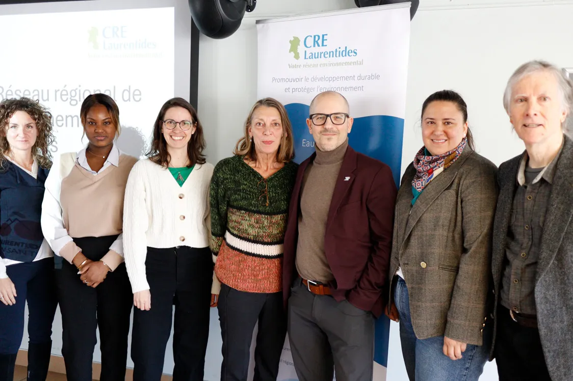 La directrice générale, Transport adapté et collectif des Laurentides (TACL), Marie-Claude Beaudet, l’agente de projets en mobilité, CRE Laurentides, Mariam Abdoul Wahab Seyni, la directrice adjointe CRE Laurentides, Anne-Sophie Monat, la directrice générale, CRE Laurentides, Anne Léger, le directeur de la planification du territoire et du développement durable, Ville de Sainte-Agathe-des-Monts, Éric Henry, la directrice, MOBA/Mobilité alternative, Élisabeth Tremblay, le président du CRE Laurentides, Philippe Roy