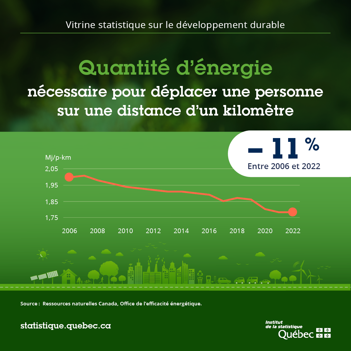De 2006 à 2022, la quantité d’énergie nécessaire pour déplacer une personne sur une distance d’un kilomètre sur la route a diminué de 11 %.