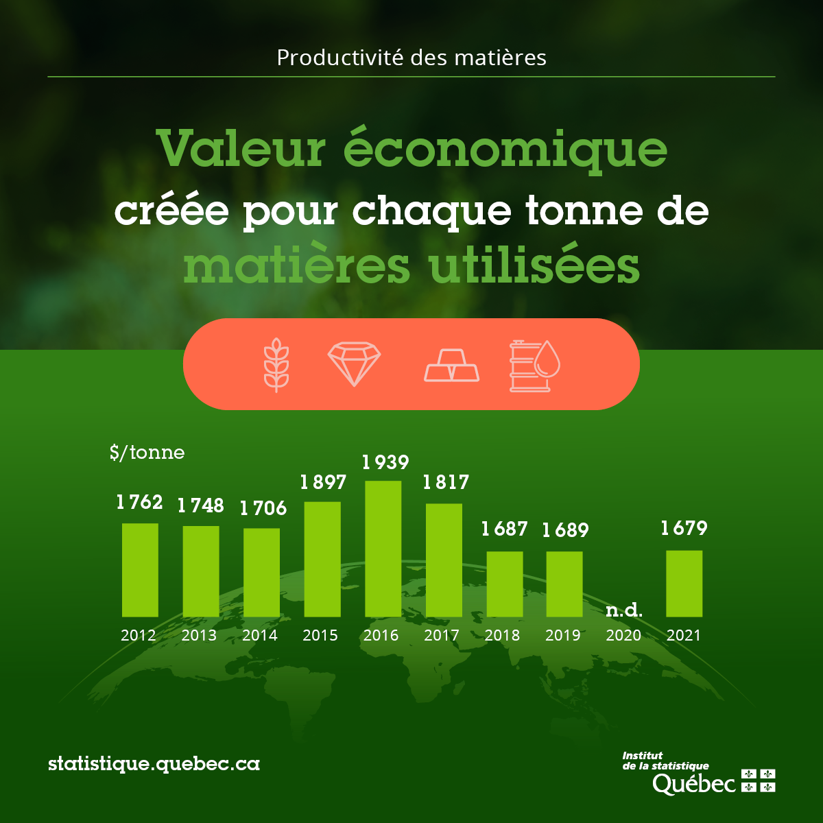 La productivité des matières au Québec, qui s’exprime en valeur de PIB généré par tonne de matières consommées par l’économie, était de 1679 $/tonne de matières en 2021. En présence d’une économie plus économe en ressources, l’indicateur devrait augmenter. Le niveau de 2021 est le plus faible observé depuis 2012.