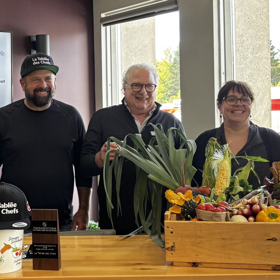 Dans l’ordre habituel : Jean-François Archambault, fondateur et directeur général de la Tablée des Chefs; Pierre Morin, président du conseil d’administration de La Manufacture Laurentides et Véronique Bernard, directrice du CFAM. / Photo: gracieuseté