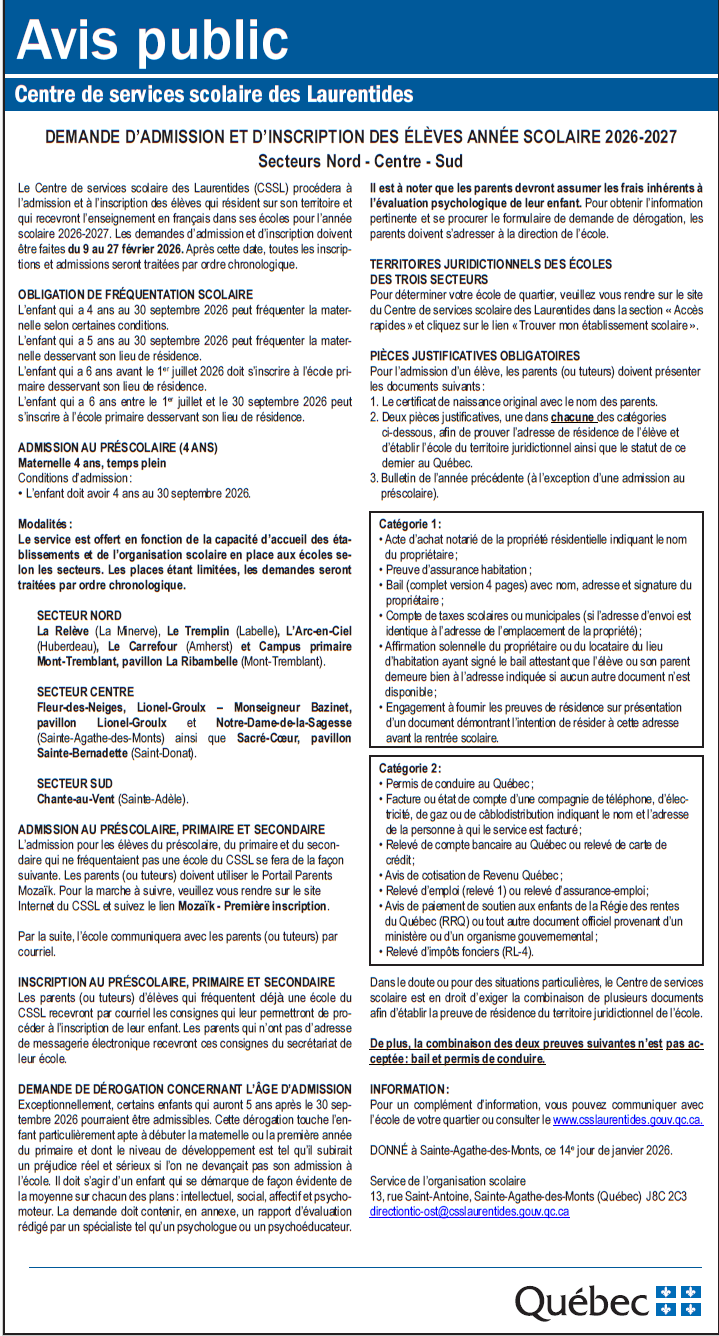 Avis public – Centre de services scolaire des Laurentides